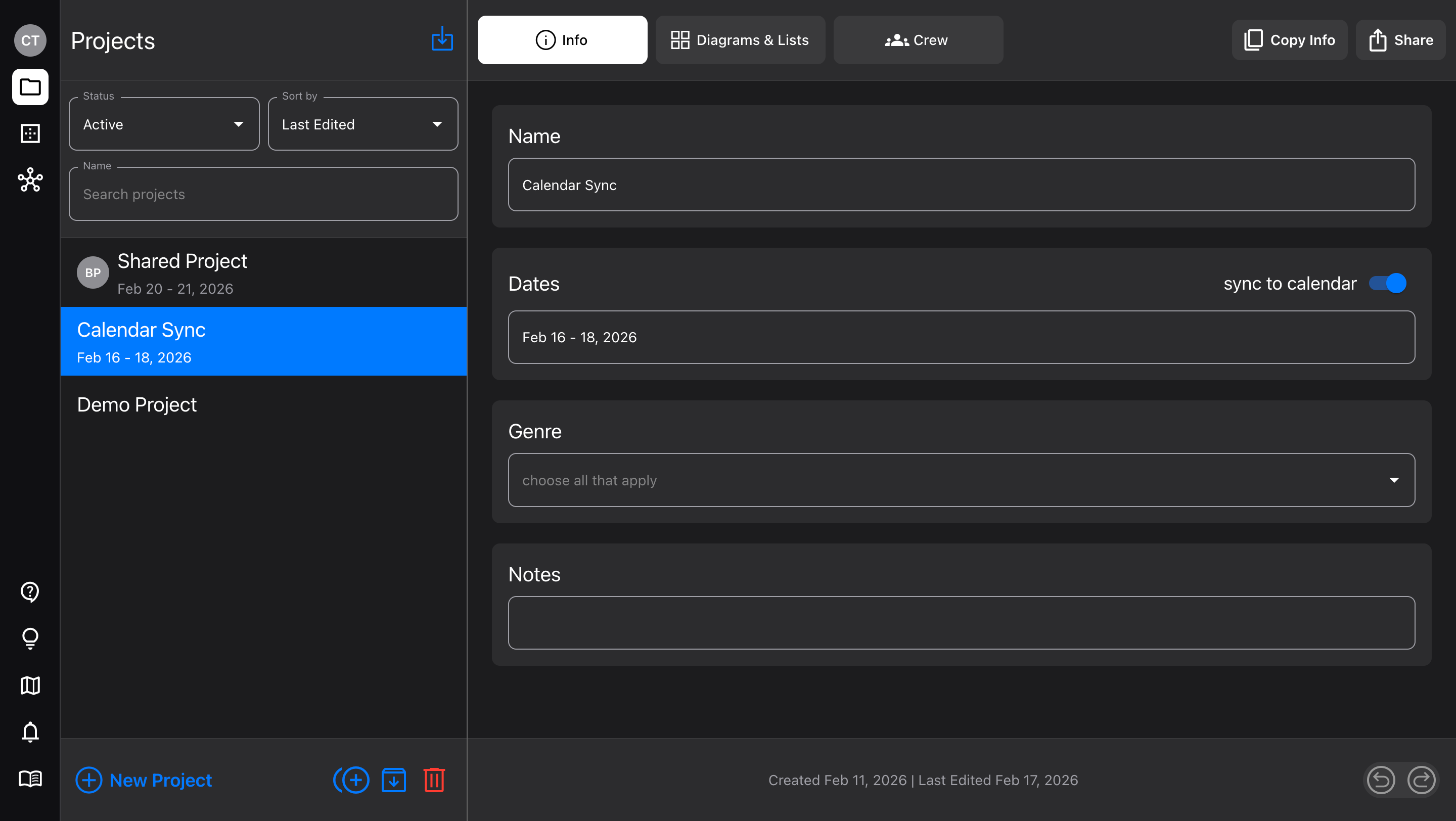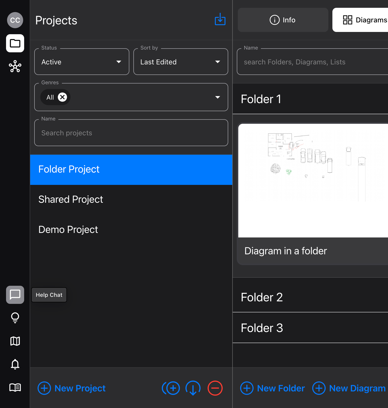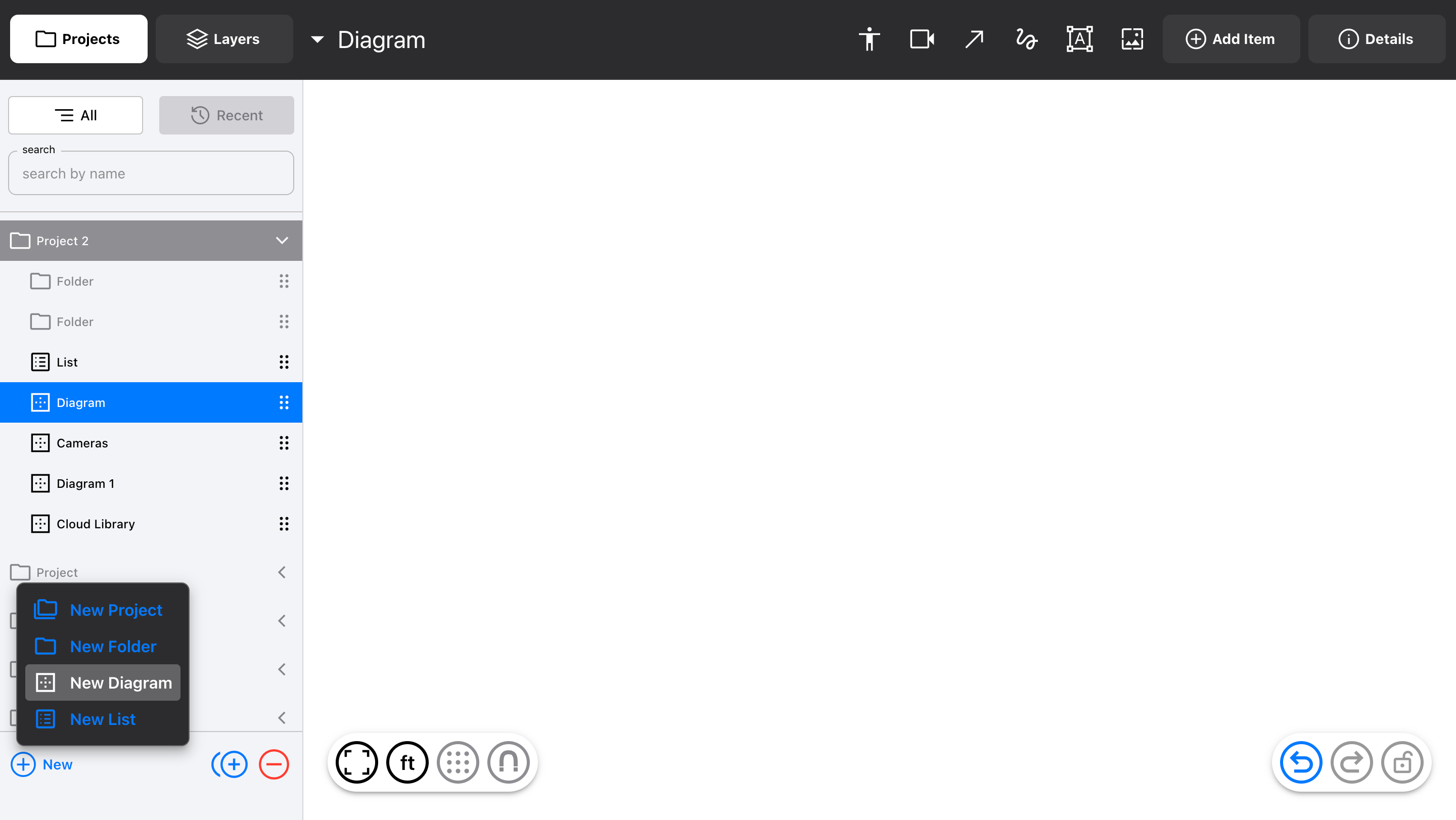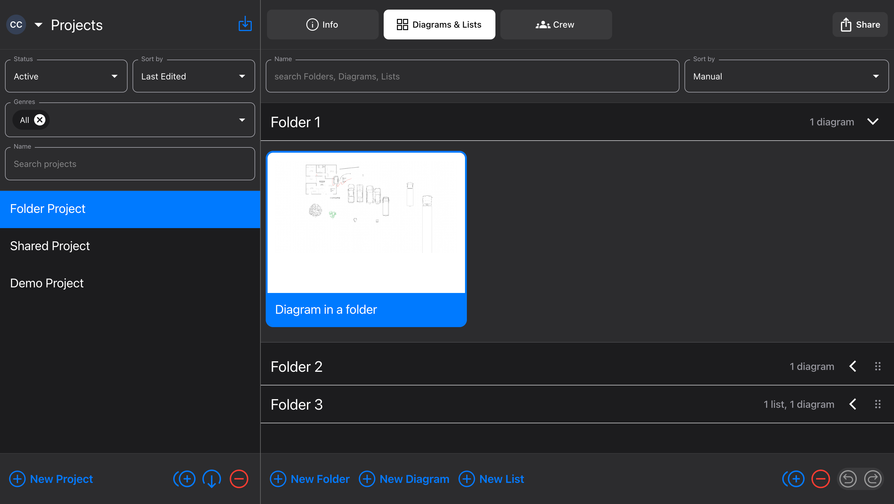 More options in the Projects sidebar, full-screen and lock buttons for Diagrams, and a manually sort-able list view for Project contents.
