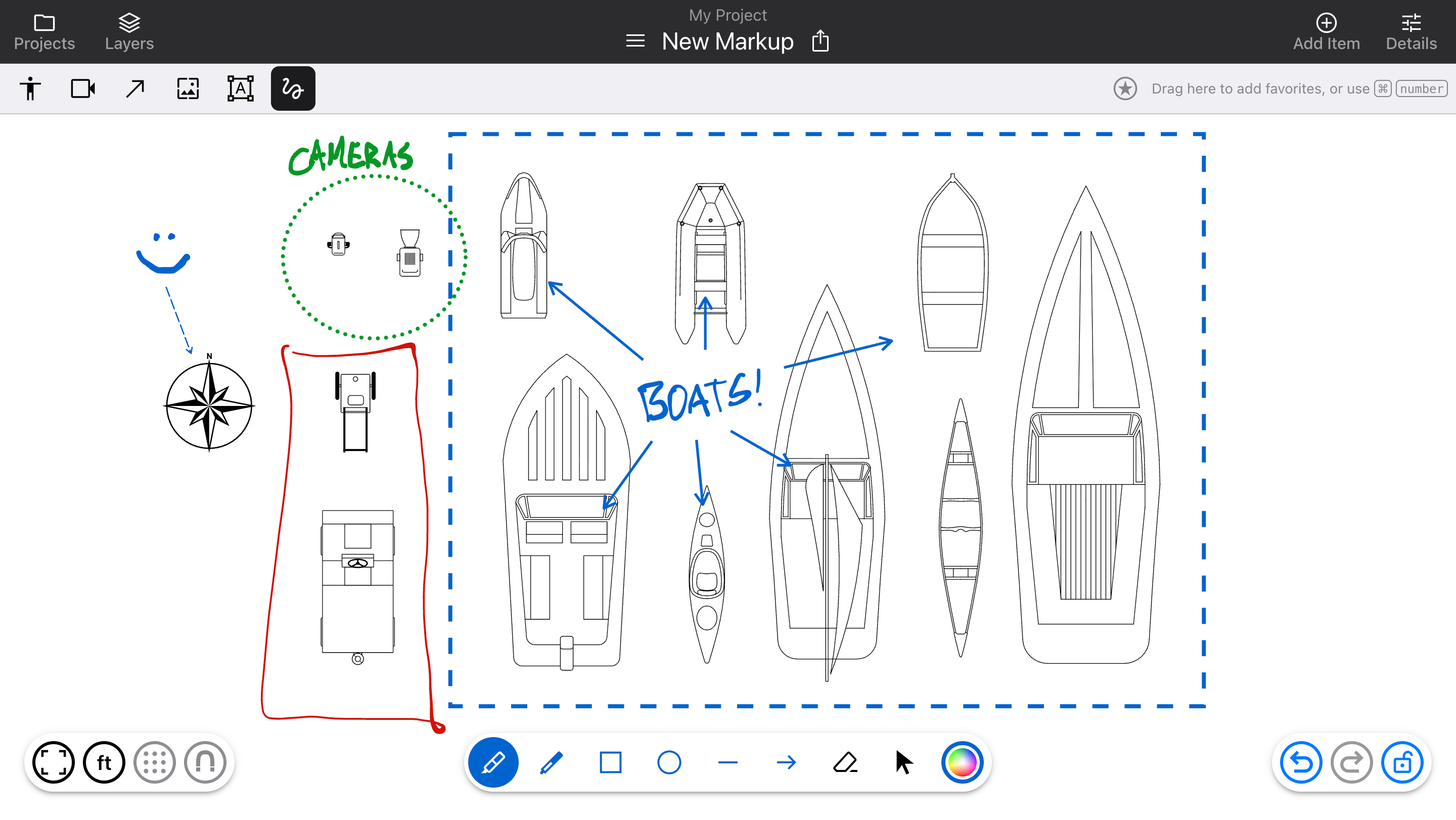 Once added, a Markup item can be resized, and have its style changed (color, thickness, dotted/dashed/solid). Use the “Select” pointer tool and click on items to see the options.
