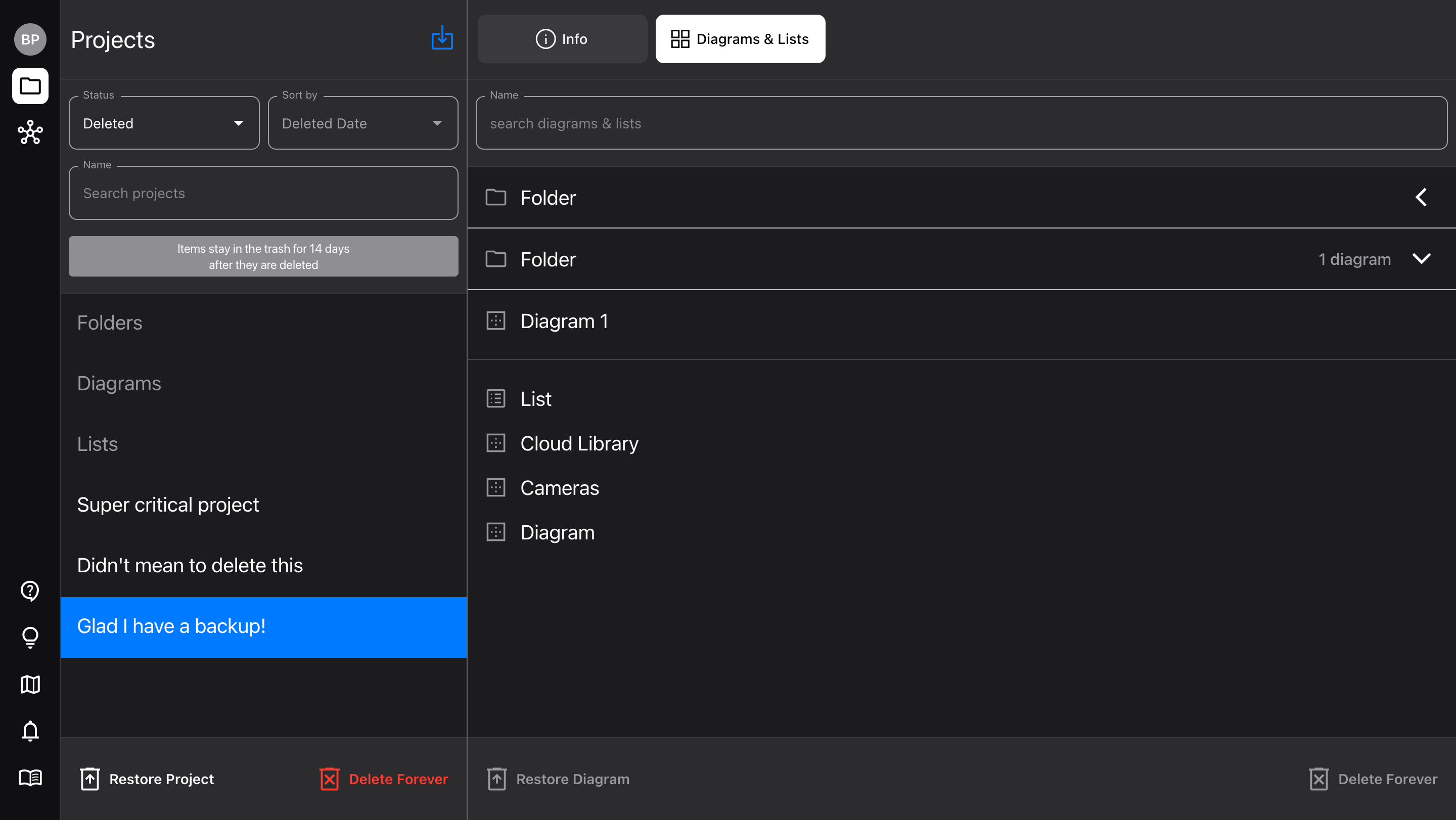 Although it’s possible to “undo” deleting a Project, Diagram, or List, sometimes mistakes happen, and you may find that one of them got away. But now there’s good news: it’s not gone!