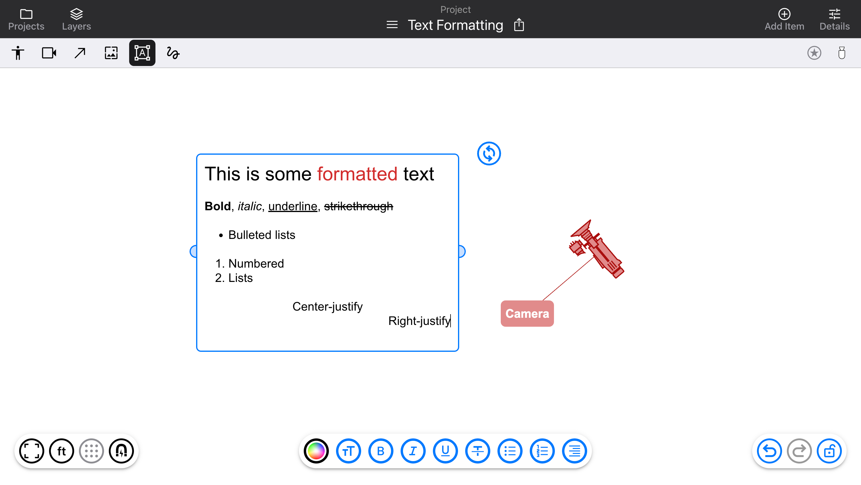 For Text items, also use bulleted/numbered lists and text justification, as well as styling individual text selections