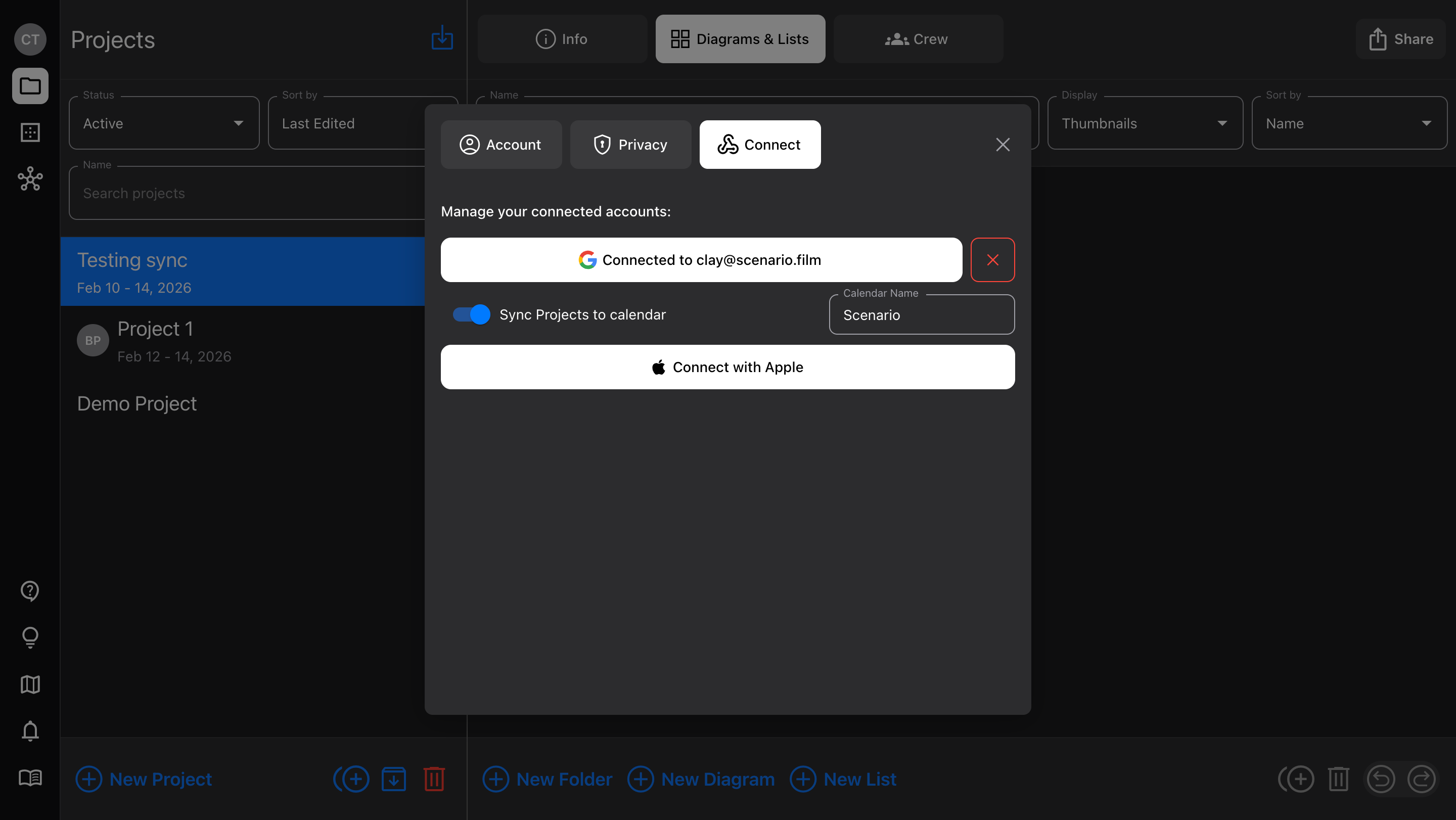 In Account > Connect, toggle on the option to “Sync Projects to calendar”